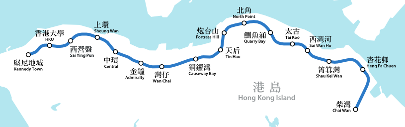 The Island Line is one of 10 lines of the MTR. It runs from Kennedy Town to Chai Wan. The line first opened in 31 May 1985. It currently travels through 14 stations in 25 minutes along its route.