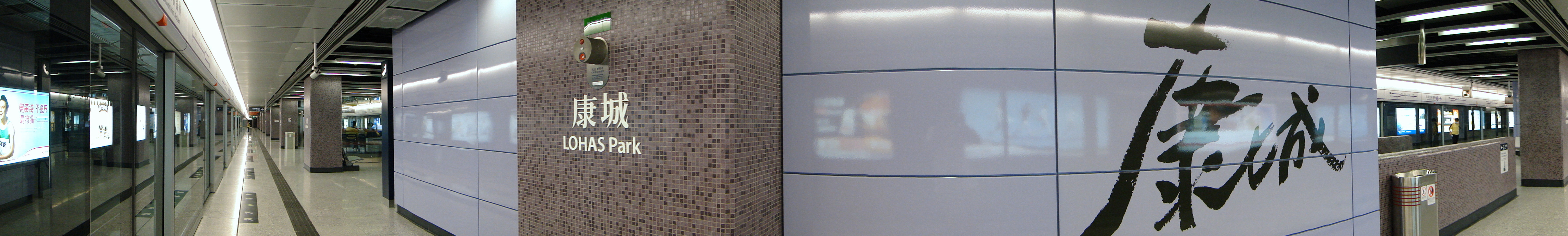 Lohas Park Station uses purple as the main color tone of the station. Like other Tseung Kwan O Line stations, the station name is printed on the baked lacquer board on the platform wall, but it is not written by Au Kit-tong.