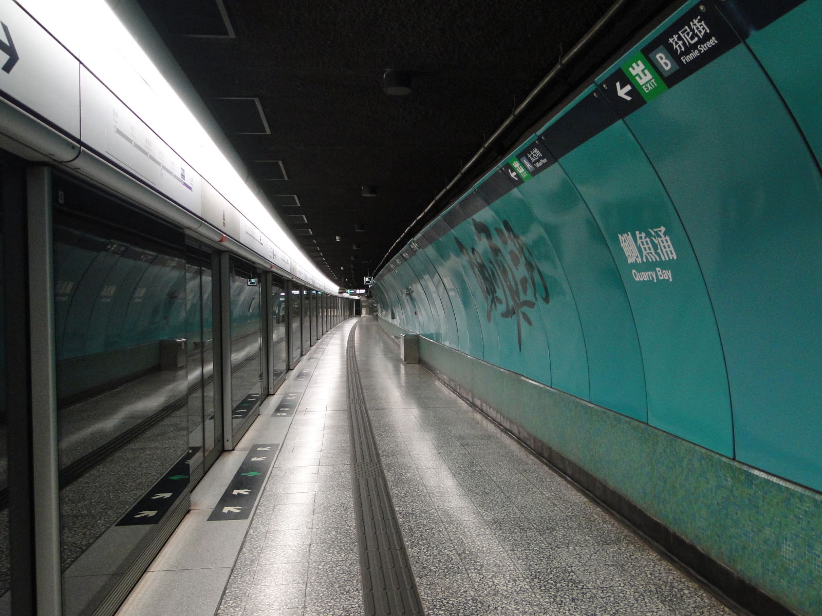 Quarry Bay Station (鰂魚涌站) is a station of the MTR in the eastern district of Hong Kong Island. It was built at the foot of Braemar Hill west of the junction of King's Road and Finney Street in Quarry Bay. It is on the Island Line and the Tseung Kwan O Line (formerly part of the Kwun Tong Line) interchange station. This station is the closest railway station to the Eastern Harbour Crossing. It is also the only station on the Island Line with a lobby on the ground. It is currently the fourth deepest station of the MTR, with a depth of 42 meters.