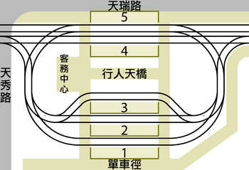 There is a Y-shaped loop (or a single-track triangular intersection at one end) in the north and south of this station, allowing trains to enter and exit the terminus platform (No. 1~3).